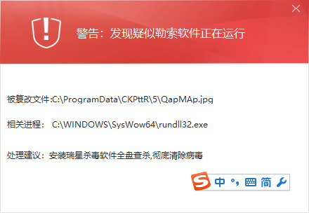 警告是发现“疑似”勒索软件在运行,如果确认没问题关闭提示框即可,不用管它了。当常被利用的进程操作了常被勒索软件加密的文件类型,又没法确定是否勒索操作时,瑞星之剑会提示用户看看是不是用户自己的正常操作。