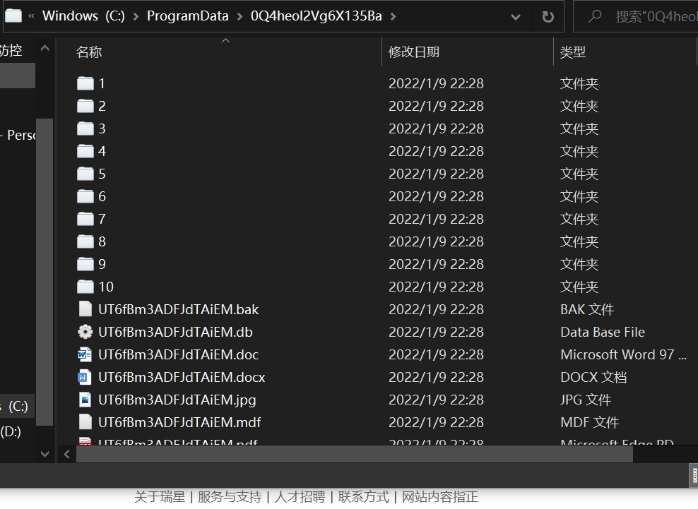 中午好,不知是否为bug,想反馈一下,偶然发现在c盘programData下存在着大量往期的防勒索诱饵文件,而且这部分内容不会删除,会一直堆积,这个文件夹本身为隐藏的,不知别的类似的文件夹是否有同样的问题,系统为win10 2101,瑞星软件版本:25.00.08.40