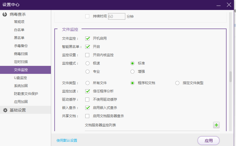 当文件监控设置为极速时,系统非常流畅;而当文件监控设置为设定为标准及以上时,有明显的卡顿感。(具体使用场景无法细说,但是与极速模式下有明显的区别。)
