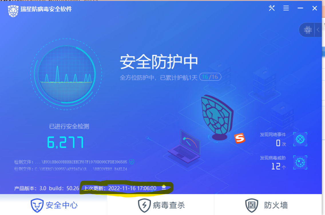 在安全中心点更新之后,你再点病毒查杀那个页面,你会发现更新时间不一致。