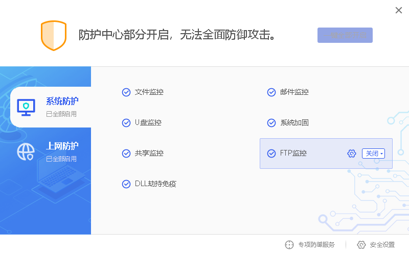 在防护未全开的情况下点击两次“一键全部开启”按钮,诱发图2
