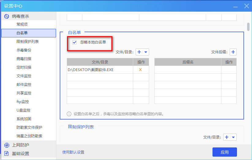 “忽略本地白名单”选项无效,即使时再系统托盘退出瑞星,再点击图标开起瑞星依旧无效。