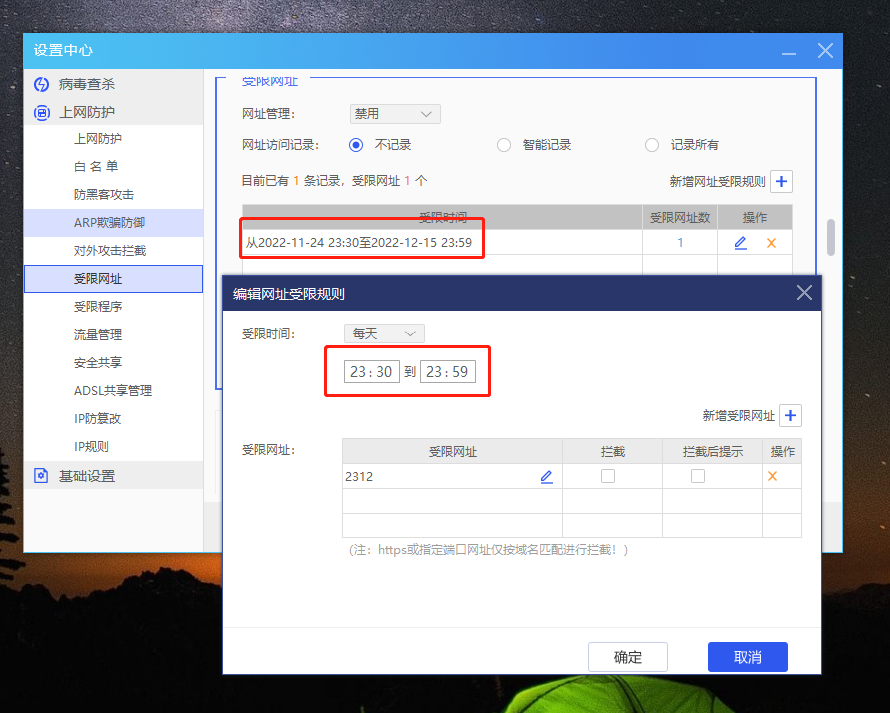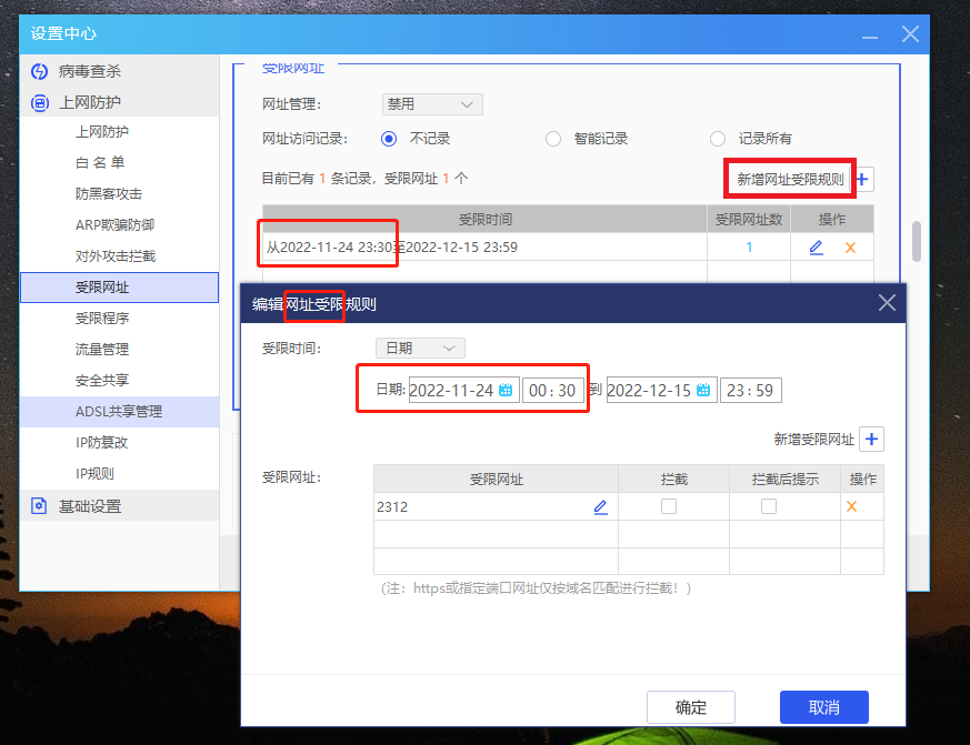 受限网址、受限程序设置规则中的受限时间是可以按每天、每周、日期来分类的,但是如果选择按日期来,则会出现一个具体时间的BUG。即:日期里面选的时间是00:30-23:59,但确定后时间还是按每天的时间来,变成23:30-23:59。