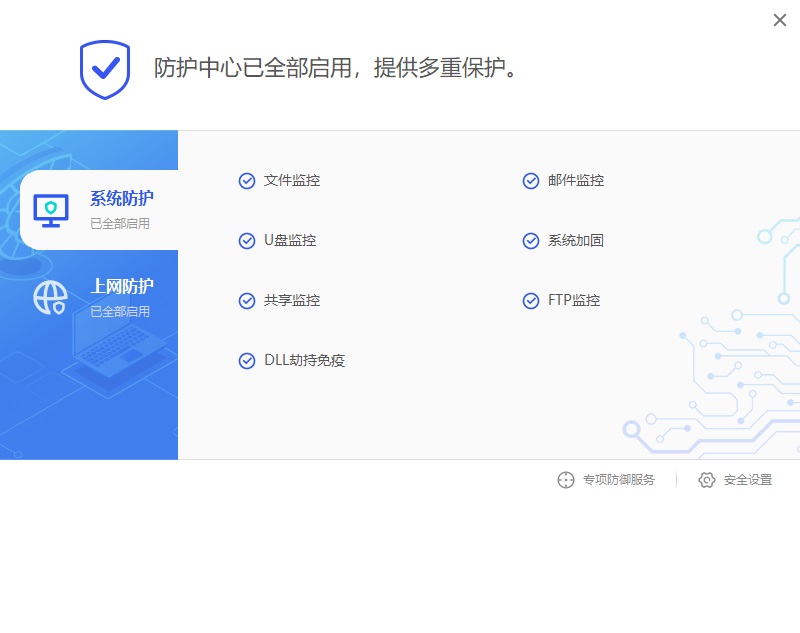 2.再点击防护中心的一键全部开启,试图打开网络防护,无法打开,但却莫名其妙的打开了系统防护中的U盘监控,且按键点击后为灰色。