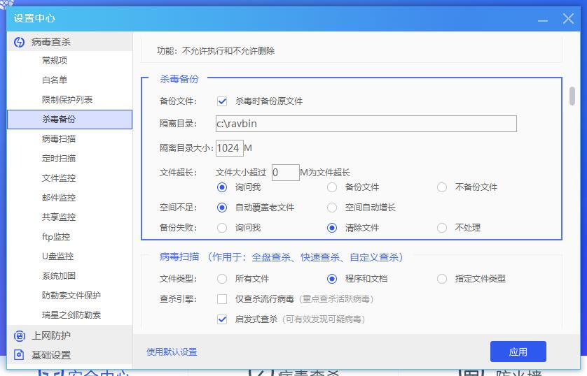 1.先把杀毒备份中文件大小从超过350M改为0M,下面改为询问我。