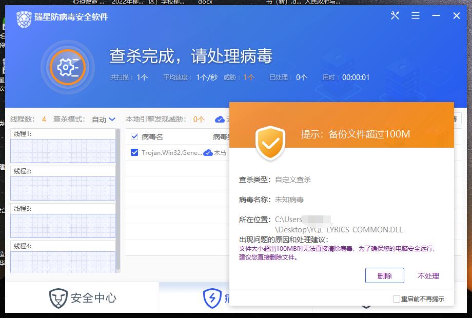3.右键点击病毒文件选择查杀,可以发现病毒,点击清除,弹出提示:文件超过100M:kaka6:,病毒名未未知病毒。这里就有问题了,病毒文件其实才几百KB,病毒名在查杀的时候已经显示了。但是这个提示框是不对的。