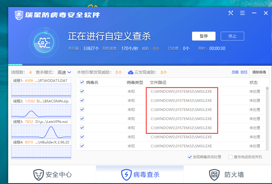 结果:瑞星报毒, 看路径很奇怪, 感觉是瑞星将系统进程识别出病毒来了, 还没有显示病毒名称