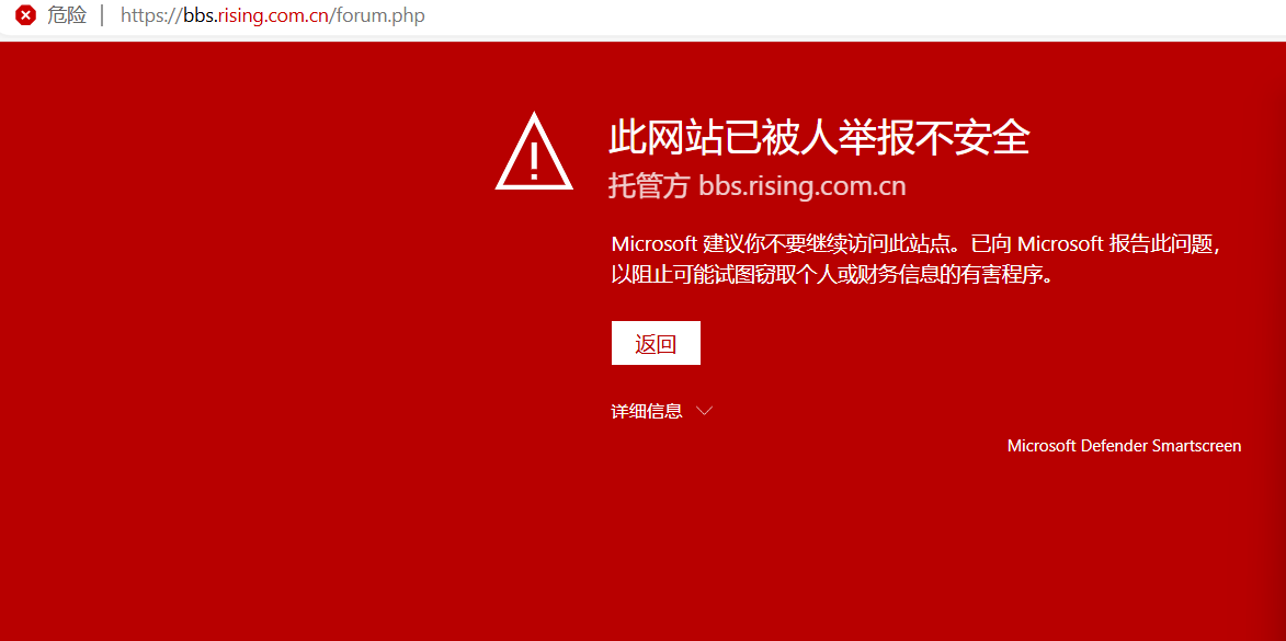 建议换用chrome或其他浏览器访问,如果一定要用Edge访问,可以先在Edge 右上角设置里,把 Microsoft Defender Smartscreen 这一项关闭: