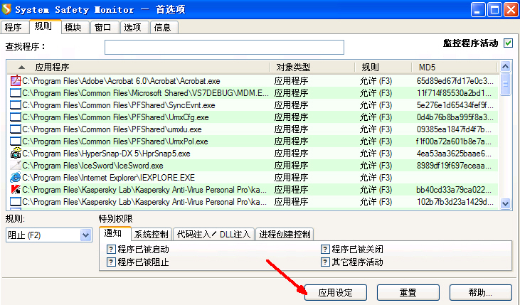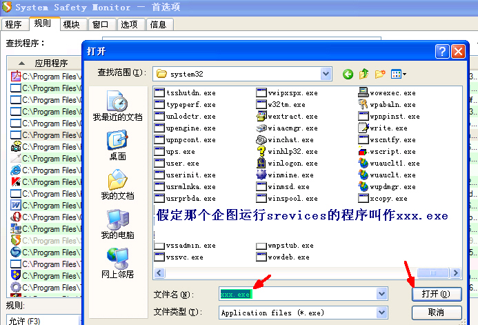 在SSM的“规则”面板中加入一条规则(假定该文件在SYSTEM32文件夹,名为xxx.exe),禁止其运行(见图1、图2)。