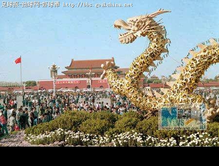 用金黄色的菊花组成的十多米长的龙,屹立在广场东侧