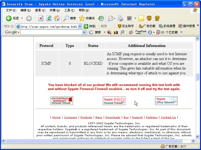 and without Sygate Personal Firewall enabled... so turn it off and try the test again.