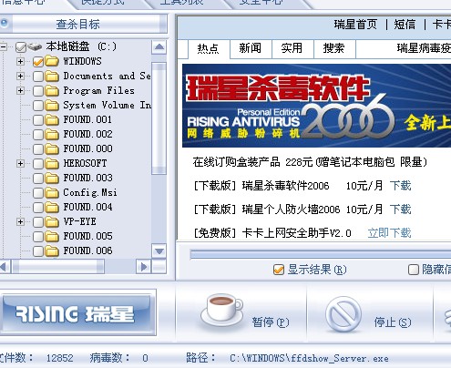 就是这个ffdshow_sever.exe没找到,删除不到.瑞星扫描到的时候就跳过了,不过小弟在注册表项中删除了他的键,其他.DDL都删了.瑞星也不报病毒了,机子运行正常。但小弟怕没搞干净,希望高手指点一哈