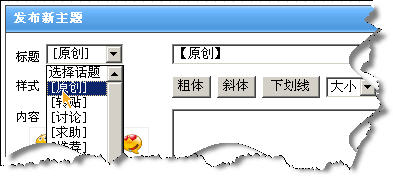 您现在标题上有“[原创]”,请您看下面的贴图,发贴时标题框左侧有个可选栏,直接可以选择“原创”或“转贴”等,就不用自己输入了