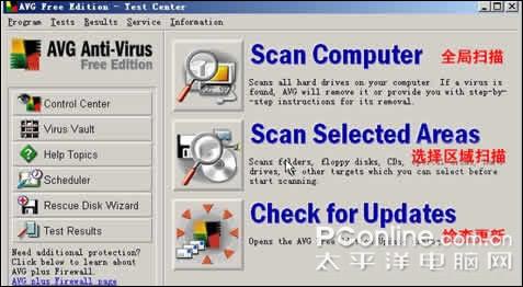 那么AVG查毒功能如何呢?点击主界面左边的“Test Center”,出现检测中心的界面(如图四)。分别有全局扫描、选择区域扫描两种扫描方式让你选择。