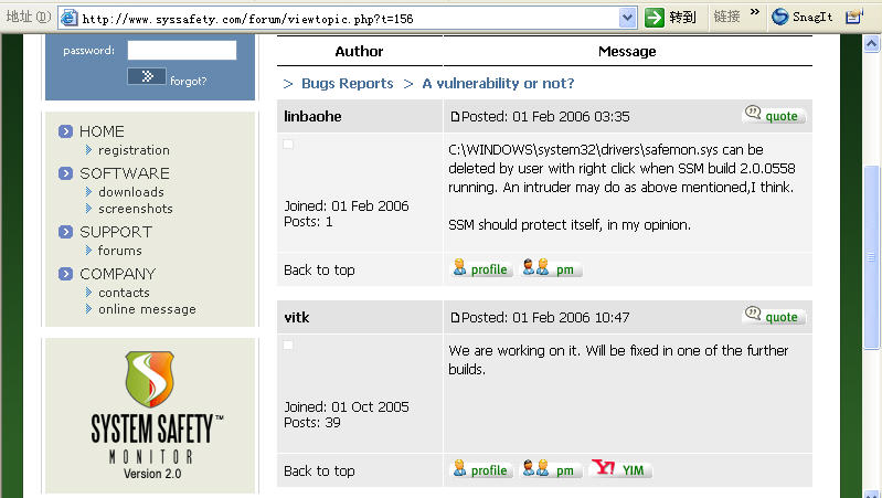 刚看了一眼我那个帖子。关于“在SSM2.0.0.558加载运行的状态下,%system%\drvers\safemon.sys可被右键删除”问题,vitk回复了。说在下一版解决这个问题(见附图)。