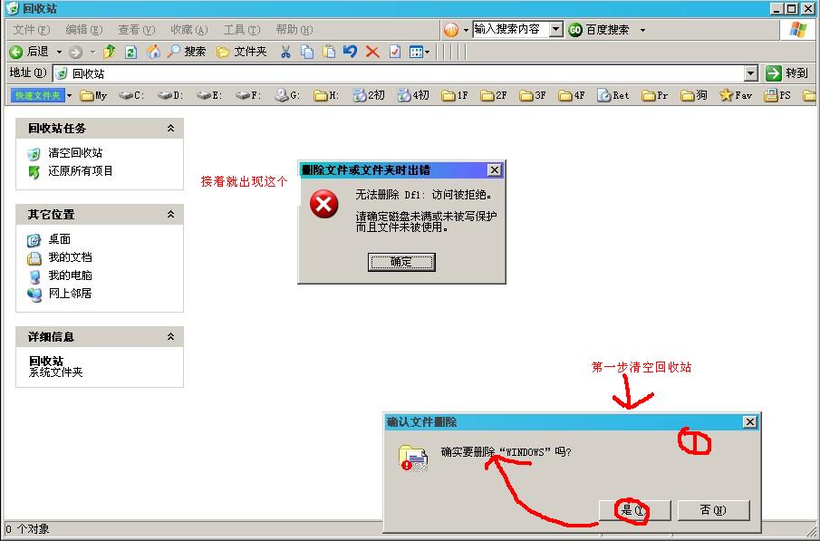 自己没有建立WINDOWS文件夹,系统盘里面的WINDOWS也在,为什么清空回收站就出现这个问题???大侠们有过这样类似的情况吗???