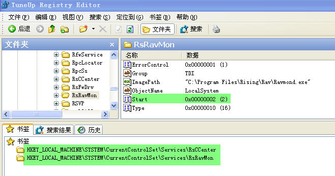 打开注册表编辑器,按下图检查瑞星的两个服务项的start键值。如果你的不是像图中显示的那样,请自己改过来。