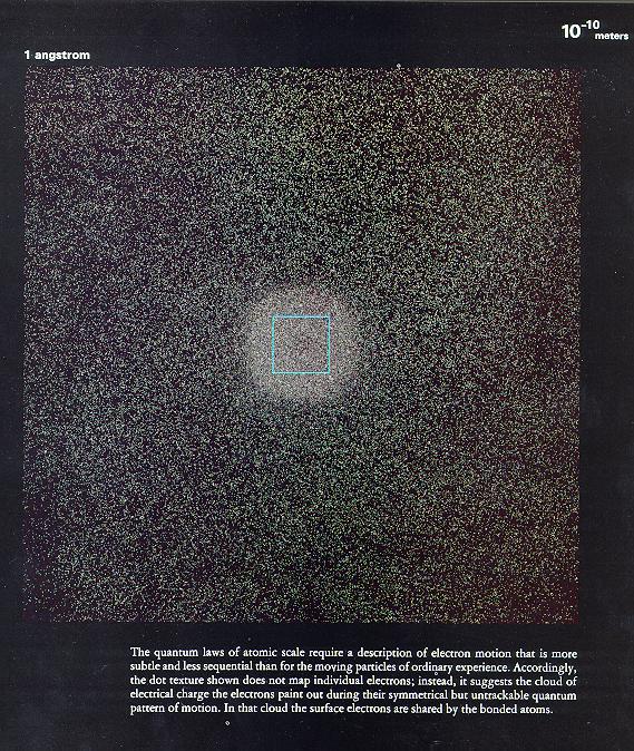 上过中学的就都应该知道:原子是由原子核和电子组成的。下图中所表示的是密布的电子云,我们能看到原子核外围的电子云比较浓。
