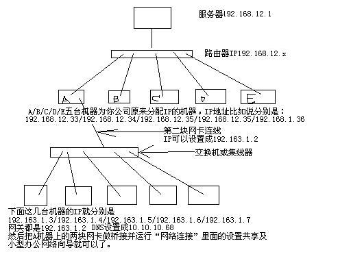 现在我想共享电脑A的静态IP让其它5台新电脑也能上网.你说在电脑A上再安装一块网卡,将新安装网卡的IP设置为192.163.1.X,但是这个IP和电脑A的IP不在一个网段啊?我可不可以将新电脑IP设置成192.168.12.X?