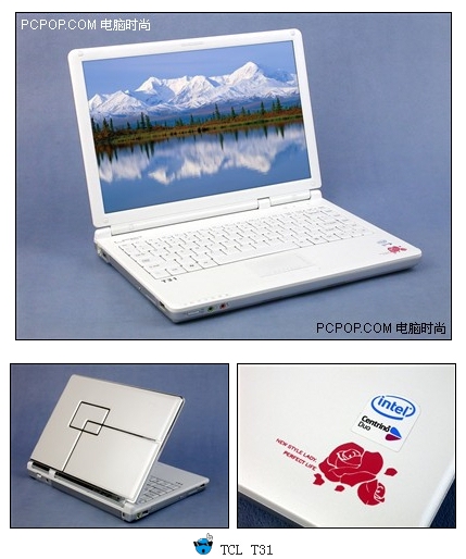 TCL的T31机身如玉般洁白,顶盖上简洁的线条勾勒出了雅致的美丽,机身右下角的“New Style Laby Perfect Life”更是表现出了本机是女性时尚生活的最佳拍档。T31使用了13.3英寸宽屏显示器,兼顾了视觉效果与移动特性。