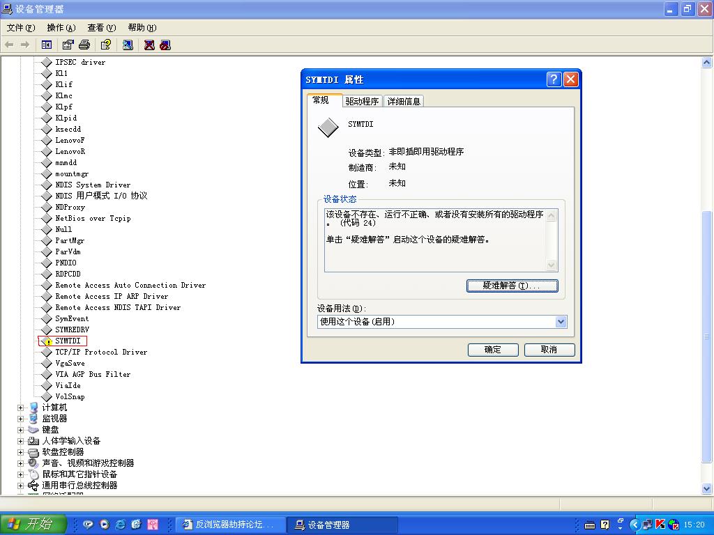 今天查看了设备管理器中的相关内容.其他的都正常.只有非即插即用驱动程序中的