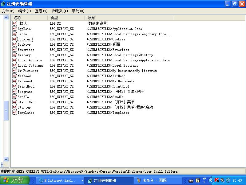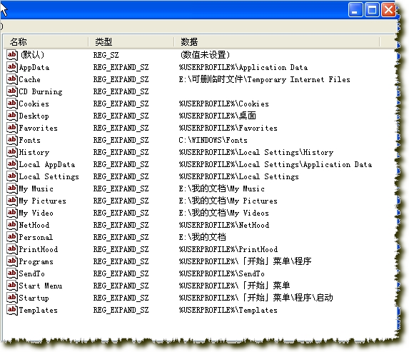 “Cache”这一项为什么指向E盘?你在E盘保存了临时文件吗?可以点亮“Cache”,“编辑”--“修改”,在“数值数据”里写入“%USERPROFILE%\Local Settings\Temporary Internet Files”。还可再删掉“CD Burning”这一项,反正也没有键值。
