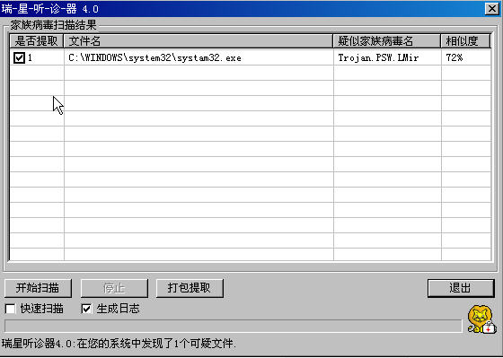 应用瑞星的听诊器查出systam32.exe有问题,可是用瑞星的杀毒软件却查不出来,这是怎么回事?