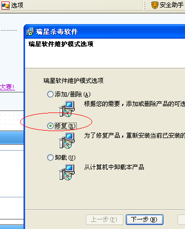 从开始---程序---瑞星杀毒---添加删除程序----选中修复---下一步 ,试试。