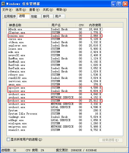 刚刚重装的系统,是XPSP2,发现进程里有两个spoolsv,一个的用户名是我的用户名Isabel Kwok,另一个的用户名是System,而且目前都没有占用很大的内存和CPU,看起来貌似是正常的,用瑞星查杀,没有报告有病毒。