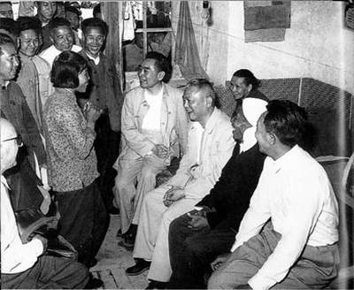 1965年5月,周恩来和李先念(右四)、罗瑞卿(右一)在大寨团支部书记郭凤莲(左前)家。右二为大寨党支部书记陈永贵。