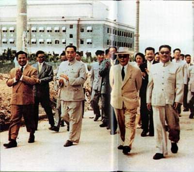 1956年7月,周恩来和陈毅在王恩茂(左一)、塞福鼎(左二)、陶峙岳(左四)陪同下,视察新疆石河子农垦区。