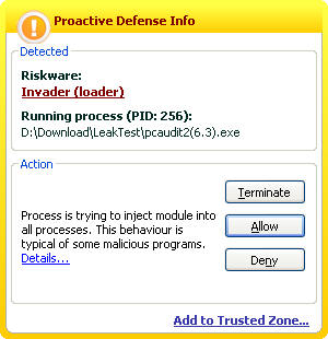 上面是Firewall Leaktest对PcAudit的描述。主要的意思是PcAudit对所有信任的程序注入DLL,通过他们穿透防火墙。 正确的测试是,测试过程中,无论是Exploer.exe或其它程序访问Intenet,只要提示里没有pcaudit.exe,你就应该放行。所以有很多防火墙,在Exploer.exe访问网络提示里没有和pcaudit.exe有关的信息,就终止pcaudit.exe的执行,是不算通过测试的。