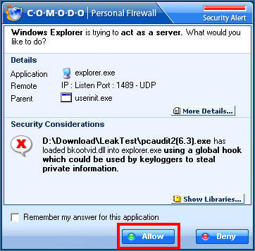 To test PCaudit correctly, say "Always" if your firewall will warn you that Explorer.exe try to access the Internet. Then try again, and if your firewall don't show you an alert about pcaudit.exe, it means that it is vulnerable...