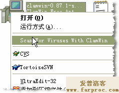 ClamWin还和Windows的资源管理器有机结合,可以方便地使用右键菜单对选中的文件进行病毒扫描: