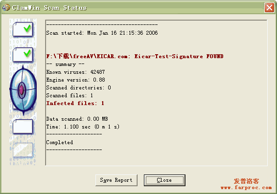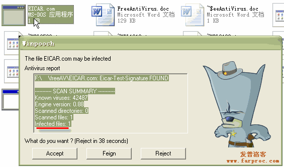 我们的看家狗会自动调用ClamWin进行病毒扫描,由于EICAR是标准的测试文件,任何合格的反病毒软件都应该有所反应,ClamWin也不例外。于是狗狗发现了敌情,一声大叫“汪”,便跳了出来