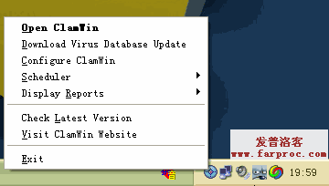 平时使用时,也可以用鼠标右击托盘区的ClamWin图标,可以弹出右键菜单,进行快捷操作: