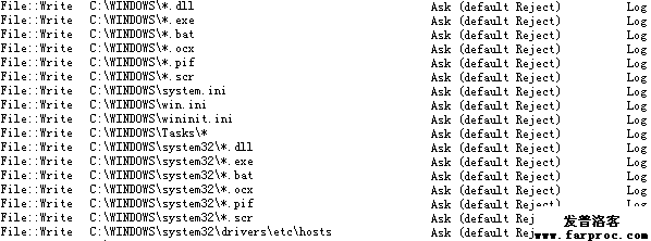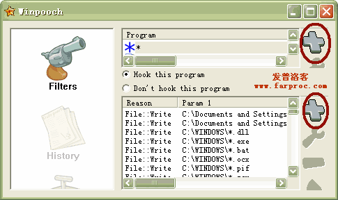WinPooch的一个过滤器(filter)是由右上方的一个进程文件路径(Program)和对它的若干条规则组成的。点击上面一个“+”可以添加一个Program,选择该Program然后点击下面的“+”可以给它制定一条规则,支持通配符*和?。WinPooch的Filter添加有点麻烦,我们在添加自定义Filter之前还是先来分析一下它的默认Filters: