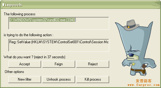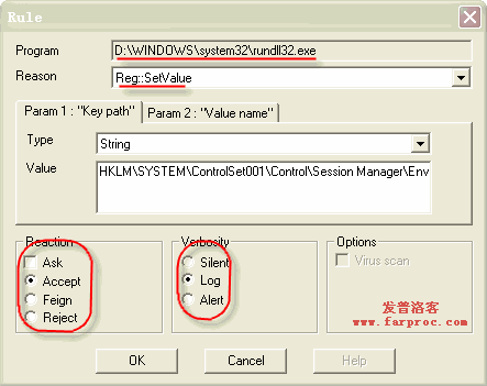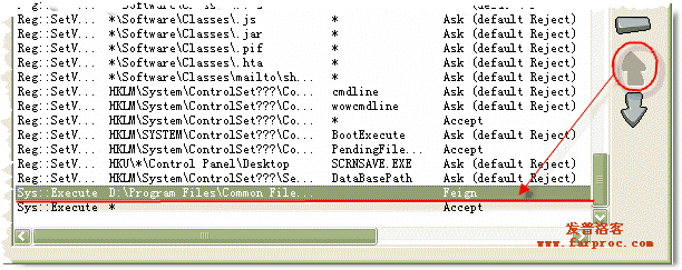 由于是应用于“*”即所有进程的,所以,第一行可以解释如下:“当任何进程(“*”)新建或更改(Write)“C:\Windows\”系统目录下的任何dll文件时,弹出对话框询问(Ask),如果在规定的时间内没有做出选择就默认拒绝该操作(default Reject),并在日志文件记录(Log)。”第二~六条和第一条类似,只是分别针对exe,bat,ocx,pif和src文件的。后面的就不一一解释了。