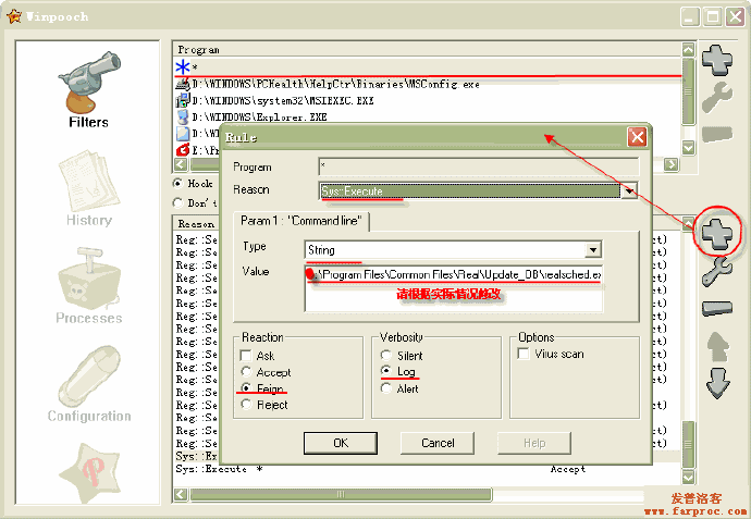 它的含义为在任何进程执行任何其他进程(*)时,调用ClamWin进行病毒扫描(Virus scan),如果没有病毒就允许该操作(Accept),否则提示用户处理。该动作及处理结果还要记录入日志(Log)。这也是WinPooch和ClamWin之所以能合作的根本原因了。