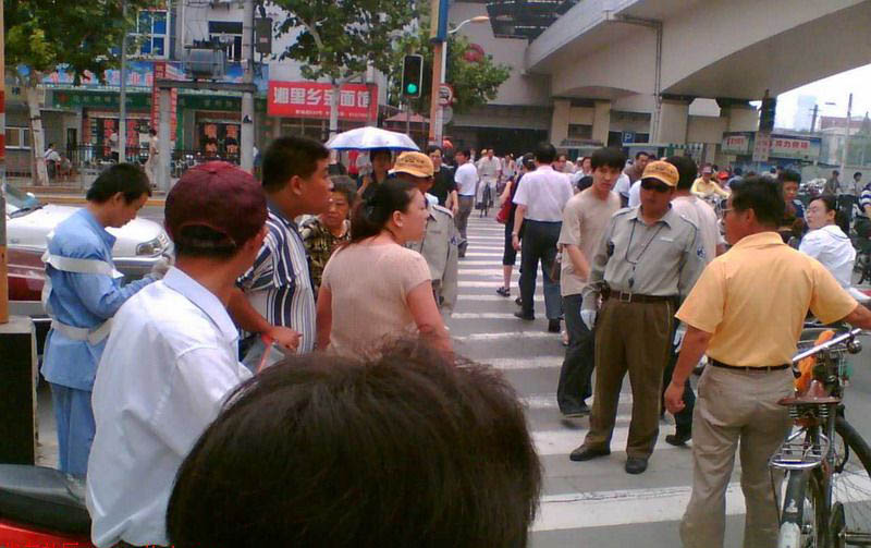 地点:上海曹杨路轻轨站路边 男子因环卫工人在打扫挡了他的道,而上前辱骂,并用手掀翻工人的草帽,一旁的协警在劝说