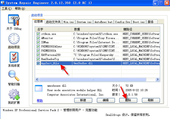 运行System Repair Engineer,使用“启动项目,注册表”选中要修复的项,点“编辑”在“值”里删除KB6087692.LOG,(仅仅删除这一段)