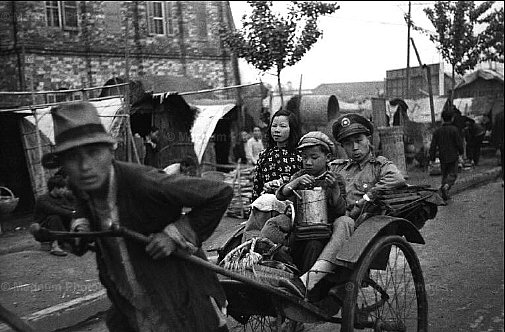 1949年4月,南京,带着家庭的财产外出逃亡的国民党军官,背景是数千内战难民的临时住处