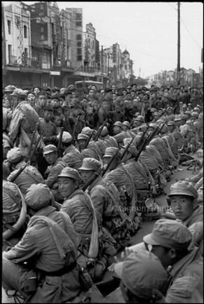 1949年4月,南京,在市民的关注下首批进城的解放军士兵。由于解放军的纪律要求不拿群众一针一线,所以这些士兵背着所有的生活用品。