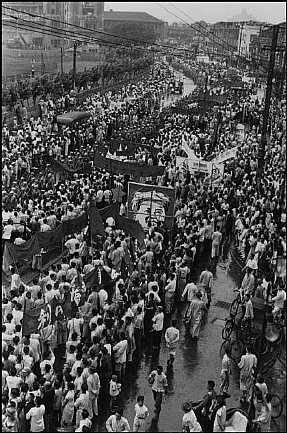 1949年4月,南京,首批进城的解放军士兵席地休息,旁边挤满了围观的市民。