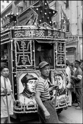 1949年6月,上海,为庆祝城市解放,电车上悬挂的领袖像。
