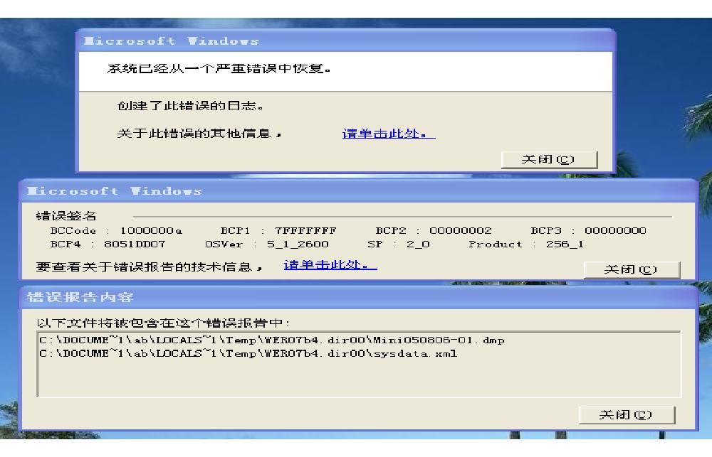 补充:最上面的一个是系统重启后的显示画面,后两个是我点击察看详细报告的画面。请高手帮忙啊,不胜感激。