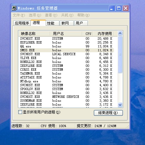 有一个进程smss.exe,别人的内存使用都是400多K,我的是占用1W多