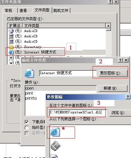 晕,不用重装IE的,在文件关联中重新设置图标就可以了,我示意的是恢复为系统默认!