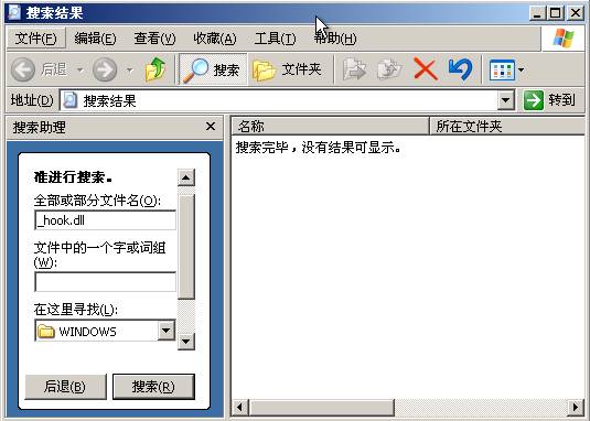 2、打开Windows的“搜索文件”,文件名称输入“_hook.dll”,搜索位置选择Windows的安装目录(默认98/xp为C:windows,2k/NT为C:Winnt)。 (图2)