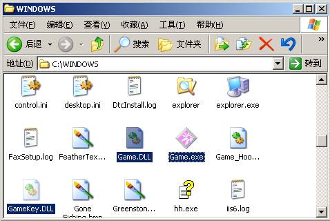 4、根据灰鸽子原理分析我们知道,如果Game_Hook.DLL是灰鸽子的文件,则在操作系统安装目录下还会有Game.exe和Game.dll文件。打开Windows目录,果然有这两个文件,同时还有一个用于记录键盘操作的GameKey.dll文件。(图4)
